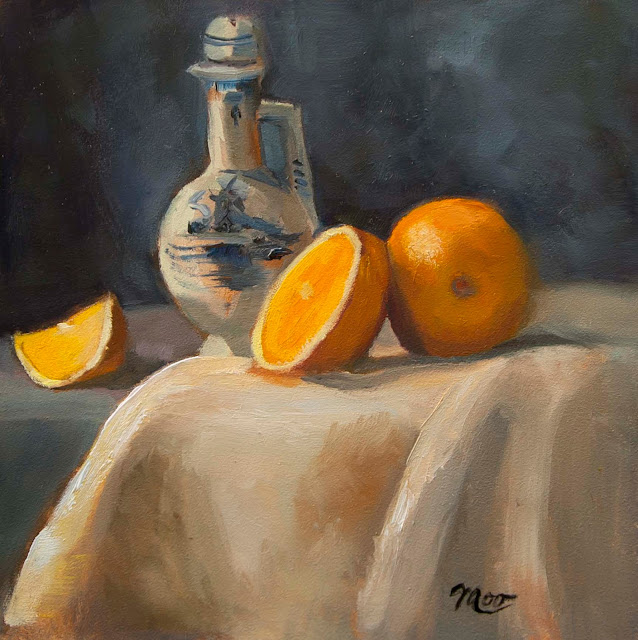 This 6X6 oil on Gessobord is my first painting in my new class. Working for two sessions on one painting is usually not my style, but I'm happy with the results. I had wanted to paint something on cloth for the Daily Paintworks Challenge. I'm fortunate that I have a special interest that gives me such a high. This oil painting on Gessobord is available in my Esty Shop.